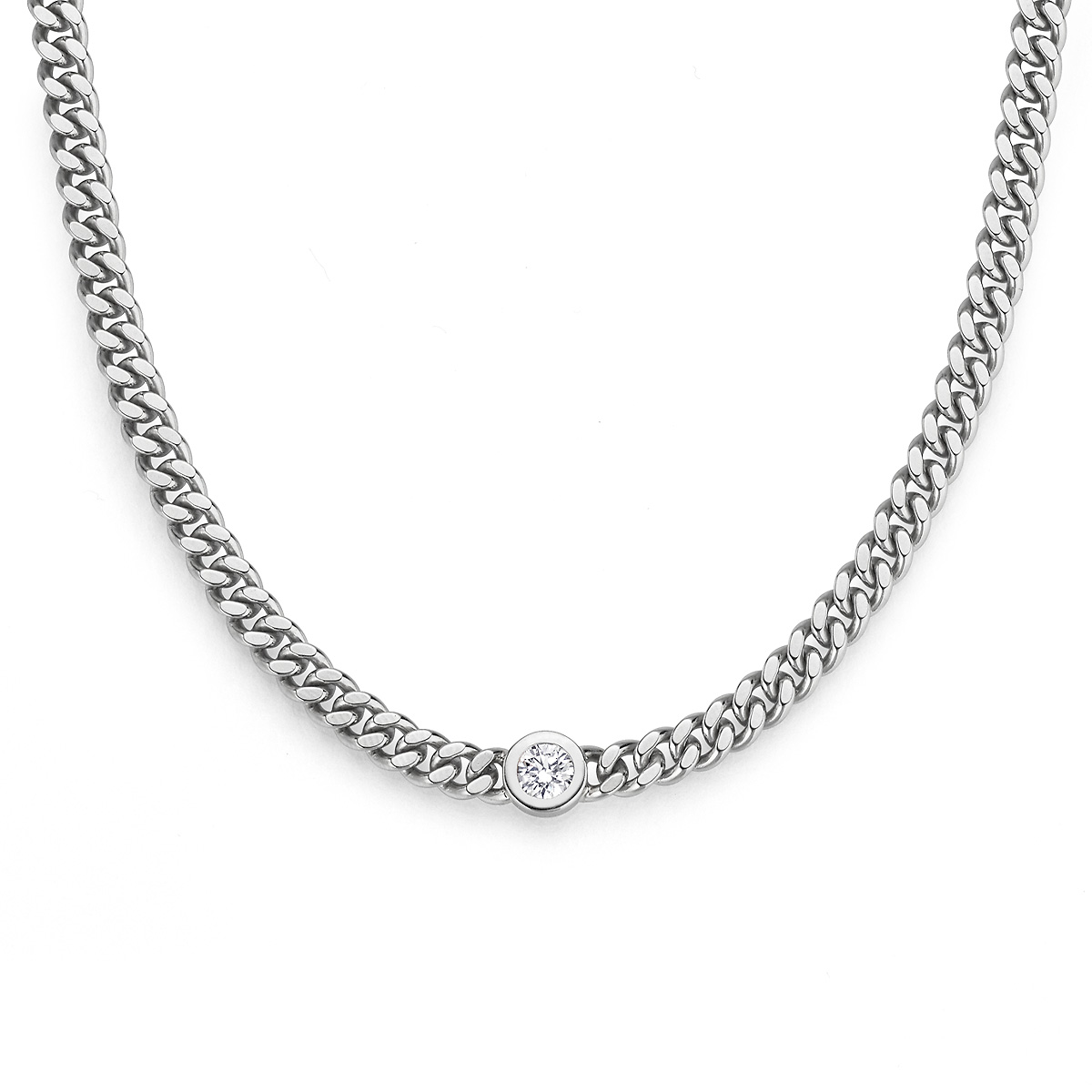 Das „My Platinum Chain“-Collier verbindet die Kraft von Platin 950 mit der Brillanz eines einzelnen Diamanten von 0,26ct. River/VS schliff: excellent – präzise gefasst, perfekt proportioniert. Die klassische Panzerkette verkörpert pure Eleganz und Understatement zugleich – gefertigt in der Manufaktur Juwelier Bley, geschaffen für die Ewigkeit