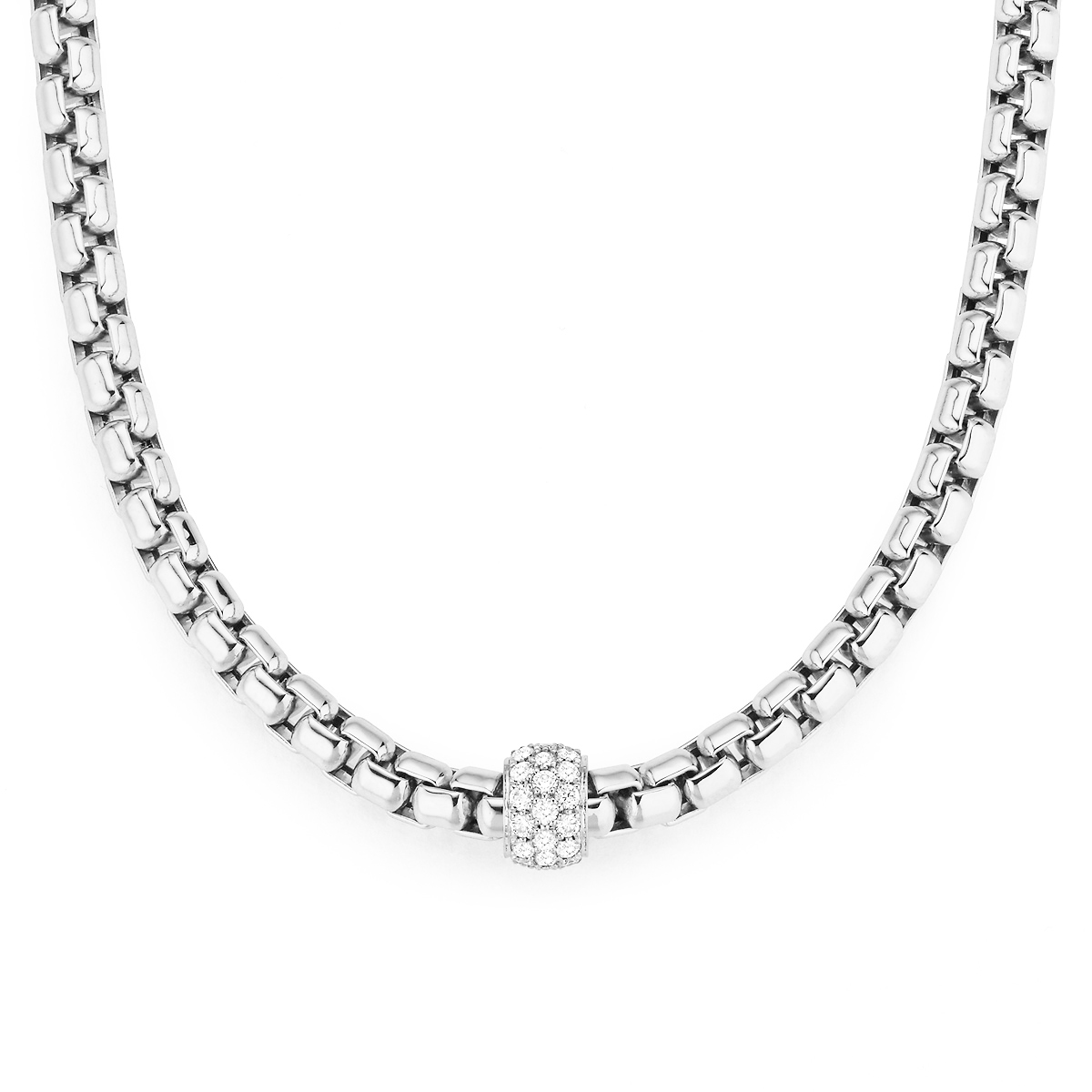 Diese edle Halskette vereint klassische Eleganz mit modernem Luxus. Gefertigt aus hochwertigem 750er Weißgold, besticht es durch sein fein gearbeitetes Gliederdesign, das sich sanft und geschmeidig um das Dekolleté legt. Im Zentrum des Schmuckstücks setzt eine funkelnde Ronde, besetzt mit brillanten Diamanten, einen stilvollen Akzent.